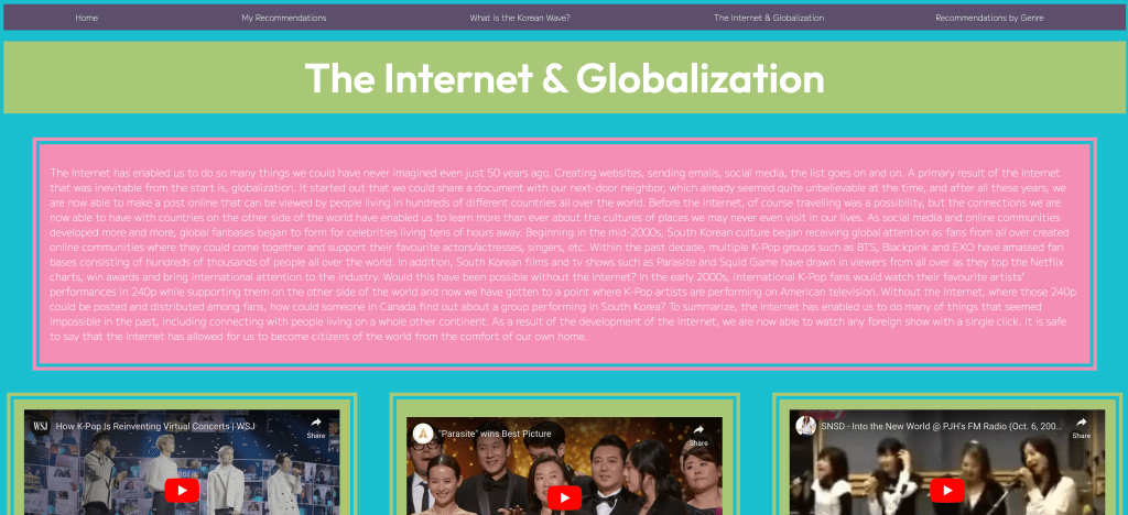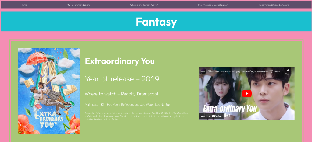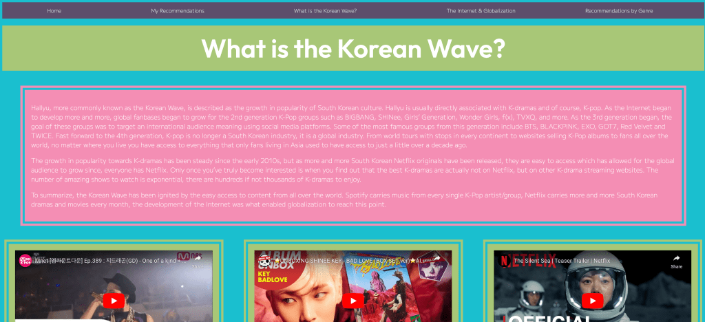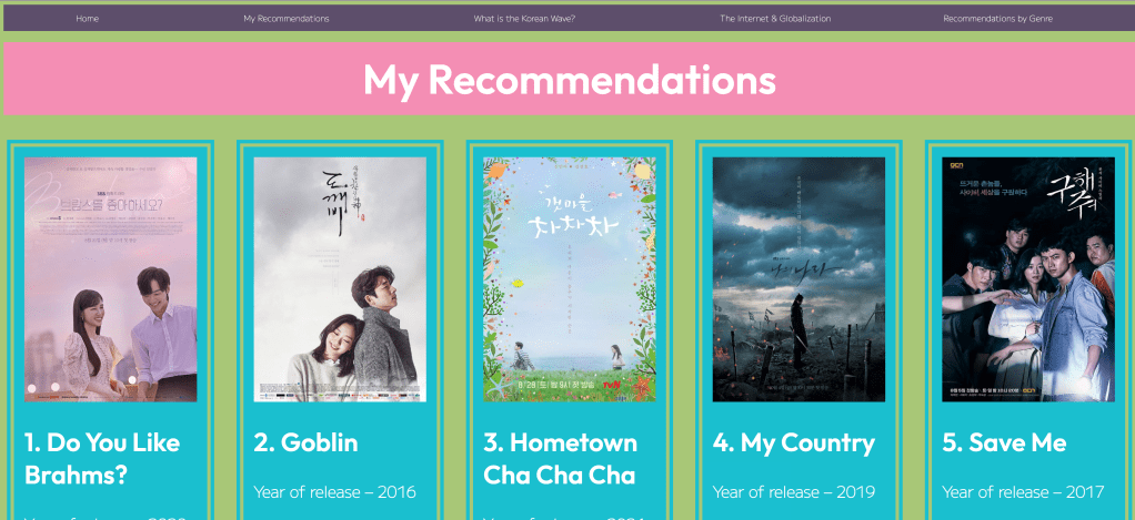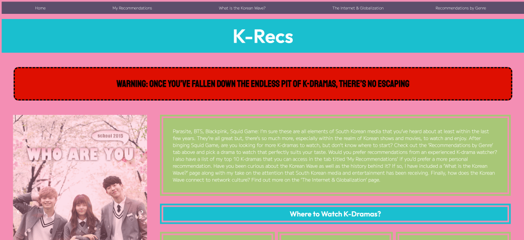 Developed with HTML, CSS, and Javascript, “K-Recs” is a user-friendly gateway to Korean media. Organized by genre with synopses and fun facts, the website offers a comprehensive introduction to Korean entertainment. With interactive features and engaging content, “K-Recs” invites exploration and discovery, catering to a diverse audience interested in Korean culture.